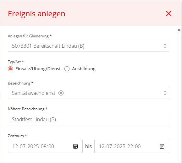Für einen klassischen Sanitätswachdienst wählst du die Bezeichnung "Sanitätswachdienst" aus und gibst den Namen der Veranstaltung bei Nähere Bezeichnung ein: