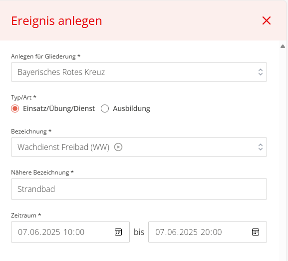 Für einen Wachdienst der Wasserwacht wählst du die Bezeichnung "Wachdienst Freibad (WW)" aus und gibst den Namen der Veranstaltung bei Nähere Bezeichnung ein: