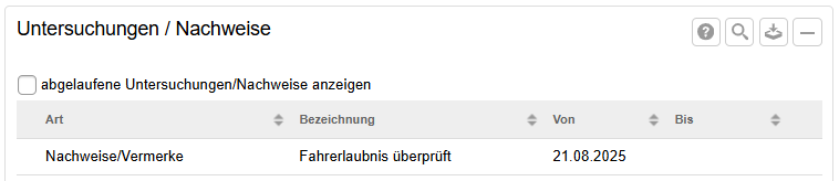 Innerhalb des drkservers werden die Führerscheinkontrollen wie folgt in der Box "Untersuchungen / Nachweise" hinterlegt: